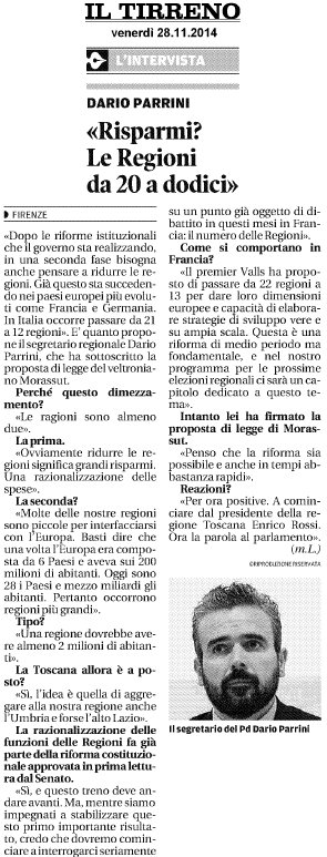 “Le Regioni da 20 a dodici”. Intervista a Dario Parrini sul “Tirreno” – 28 novembre 2014