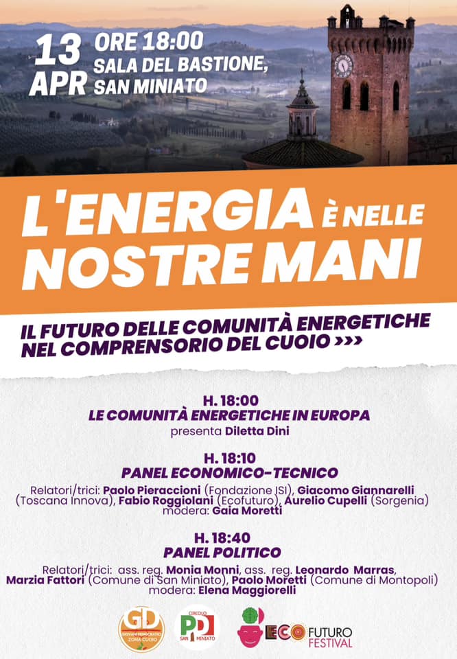 Giovedì 13 aprile alle 18 in sala del Bastione e San Miniato un approfondimento su questi temi. Assieme a rappresentanti istituzionali della regione Toscana si potrà dibattere sulle possibilità e le occasioni che le comunità energetiche attuano oggi e attueranno in futuro.