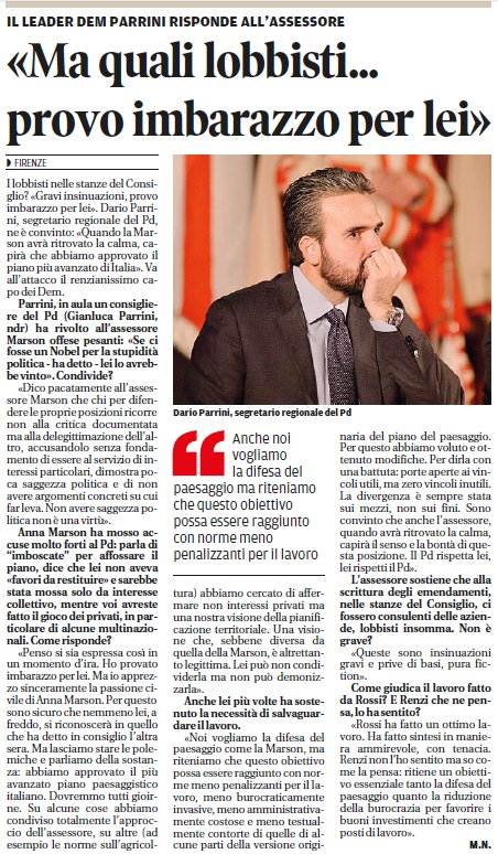 I lobbisti nelle stanze del Consiglio? «Gravi insinuazioni, provo imbarazzo per lei». Dario Parrini, segretario regionale del Pd, ne è convinto: «Quando la Marson avrà ritrovato la calma, capirà che abbiamo approvato il piano più avanzato di Italia». Va all’attacco il renzianissimo capo deiDem.