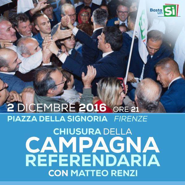 Matteo Renzi chiude la campagna per il sì venerdì 2 dicembre alle 21 in Piazza Signoria