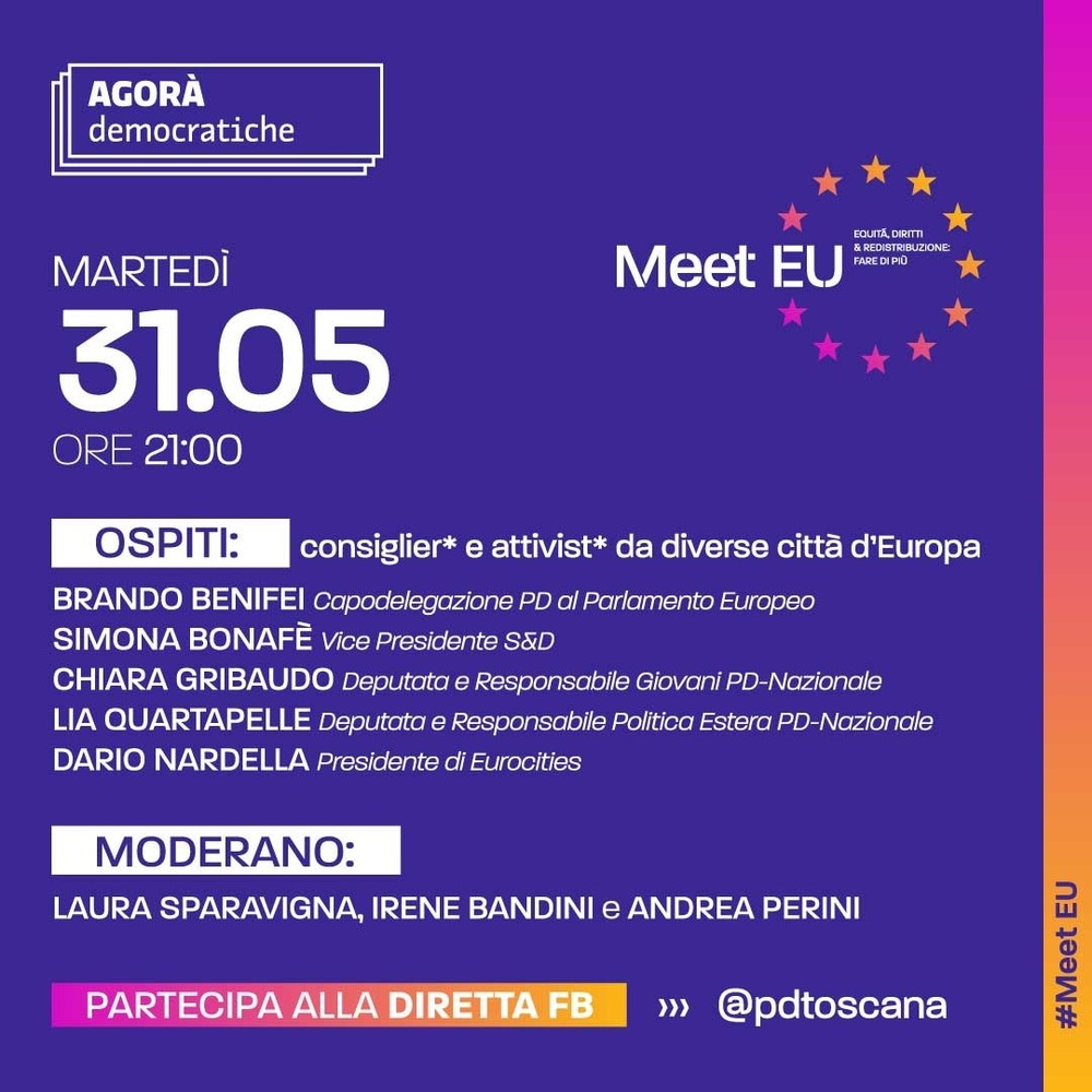 Martedì 31 maggio, alle 21 sulla pagina Facebook PD Toscana, l’Agorà democratica dal titolo “MEET EU: Equità, diritti e redistribuzione: Fare di più“.