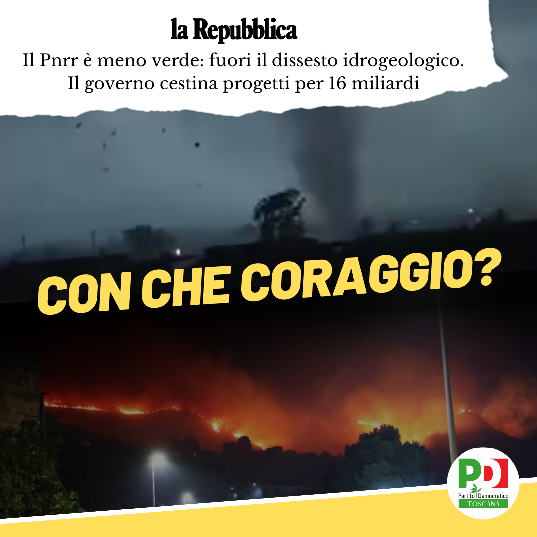 Mentre la Regione Toscana approva una mozione dove, recependo gli emendamenti del gruppo PD, decide di dare supporto ai piccoli comuni che non hanno né le strutture interne né le risorse disponibili per progettare e intercettare finanziamenti per gli interventi, dimostrando la sua attenzione e sensibilità sui temi del dissesto idrogeologico e della rigenerazione urbana, il ministro Fitto porta il Governo nella direzione opposta togliendo di fatto le risorse del PNRR.