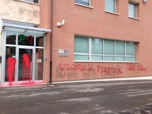 scritte-sede-2-maggio2 maggio 2014 – Ennesimo atto vandalico alla sede del Pd fiorentino e regionale di Via Forlanini. Secchi di vernice rossa sono stati gettati contro la vetrata di ingresso ed è stata impressa una scritta lunga diversi metri sulla facciata.