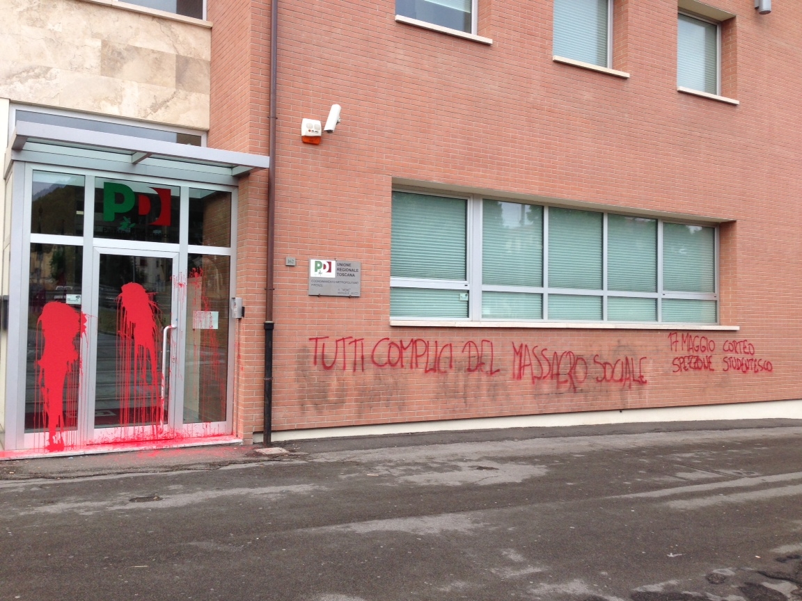 “Siamo stati spesso colpiti da questi atti negli ultimi mesi. Evidentemente ci sono gruppi che si comportano al di fuori delle regole democratiche. Ma il PD non si fa intimorire e proseguirà la sua azione politica e di governo secondo gli obiettivi che ci siamo dati e che portiamo avanti con correttezza civile e rispetto di chi la pensa diversamente da noi. Più riforme vuol dire più democrazia e più lavoro. Questi atti ci spingono anzi ad andare avanti con determinazione” ha dichiarato Antonio Mazzeo, responsabile organizzazione del Pd della Toscana, questa mattina, dopo che sono stati rinvenuti gli atti vandalici alla sede.