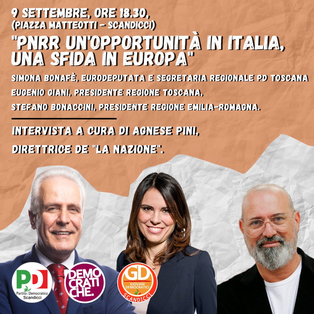 Questo pomeriggio, 9 settembre, alle 18.30, alla Festa dell’Unità di Scandicci in Piazza Matteotti si parla di “Pnrr, opportunità in Italia, sfida in Europa” con Simona Bonafé, segretaria del Pd toscano ed eurodeputata, il Presidente della Toscana Eugenio Giani e quello dell’Emilia Romagna Stefano Bonaccini, intervistati da Agnese Pini, direttrice della Nazione.