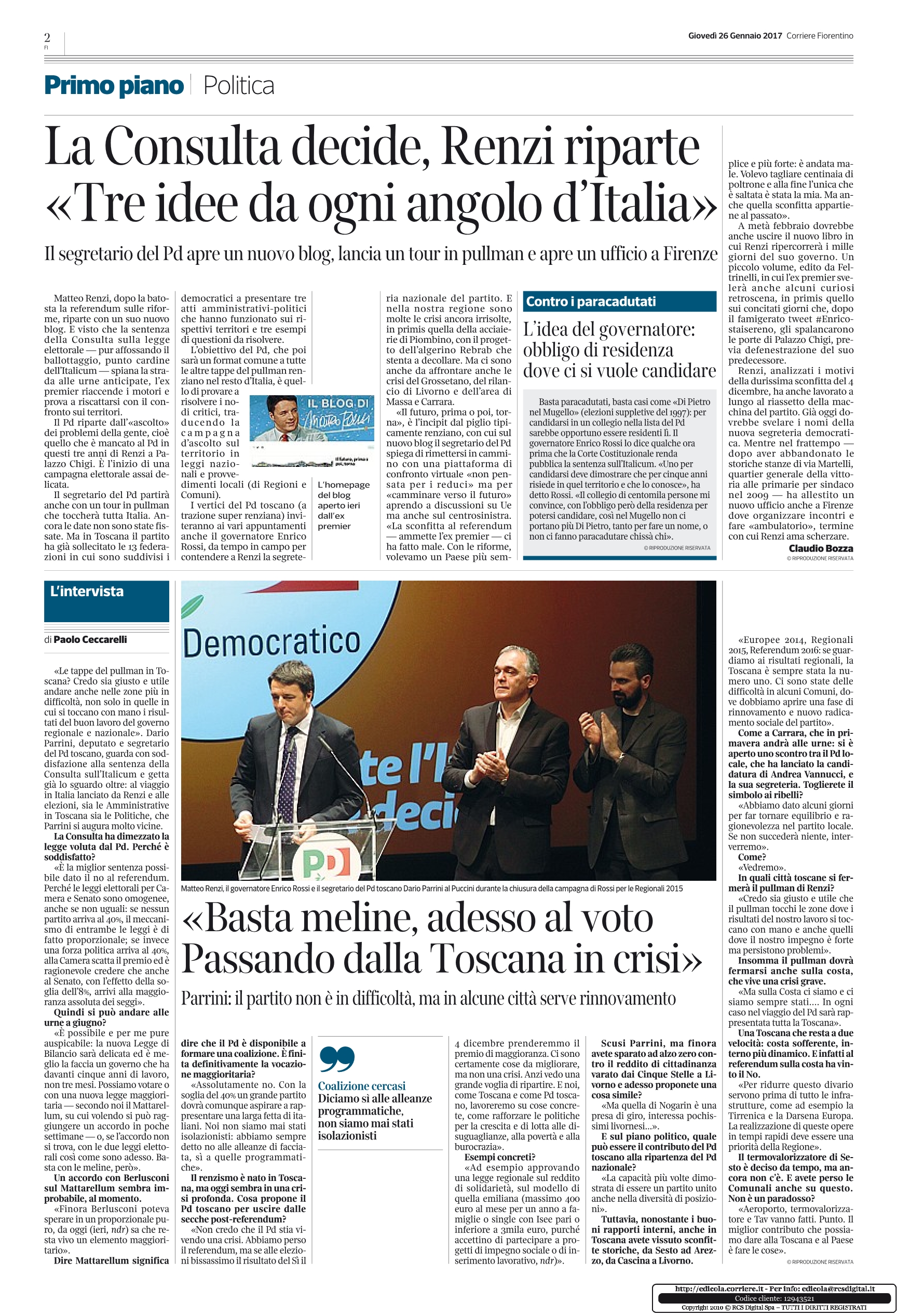 «Non credo che il Pd stia vivendo una crisi. Abbiamo perso il referendum, ma se alle elezioni bissassimo il risultato del Sì il 4 dicembre prenderemmo il premio di maggioranza. Ci sono certamente cose da migliorare, ma non una crisi. Anzi vedo una grande voglia di ripartire. E noi, come Toscana e come Pd toscano, lavoreremo su cose concrete, come rafforzare le politiche per la crescita e di lotta alle disuguaglianze, alla povertà e alla burocrazia».