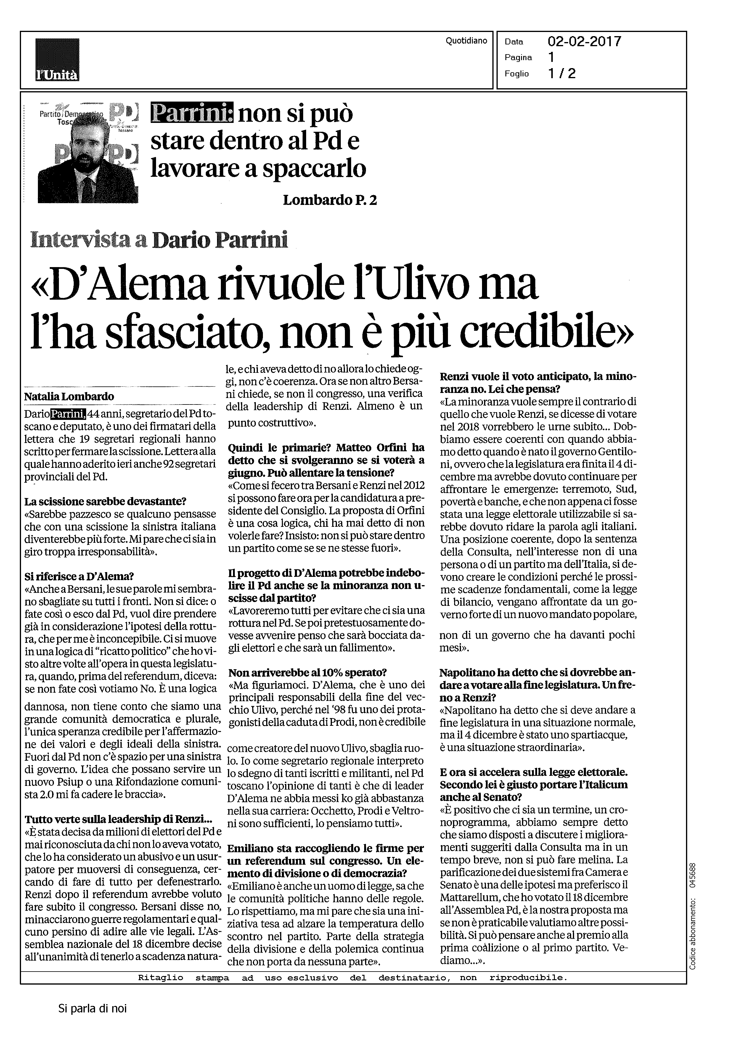 2 febbraio 2017 – “Nel Partito Democratico abbiamo bisogno di unità. Irresponsabile chi opera per dividere”. Due interviste di Dario Parrini su L’Unità e Repubblica.