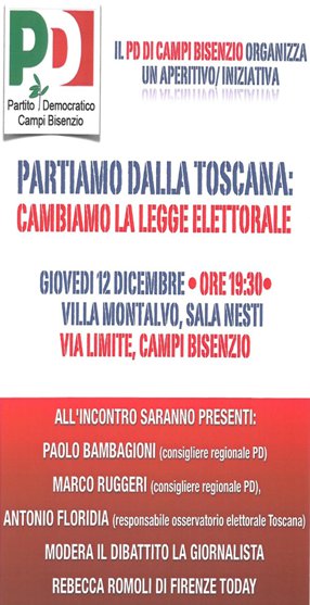 “Partiamo dalla Toscana: cambiamo la legge elettorale”. Questo il titolo dell’iniziativa-aperitivo organizzata dal Pd di Campi Bisenzio per giovedì 12 dicembre e a cui prenderanno parte il capogruppo dei democratici in Regione, Marco Ruggeri e il consigliere regionale Pd, Paolo Bambagioni. L’incontro, che si terrà alle 19.30 nella sala Nesti di Villa Montalvo, vedrà la partecipazione del responsabile dell’Osservatorio elettorale della Regione Toscana, Antonio Floridia e sarà coordinato dalla giornalista Rebecca Romoli.