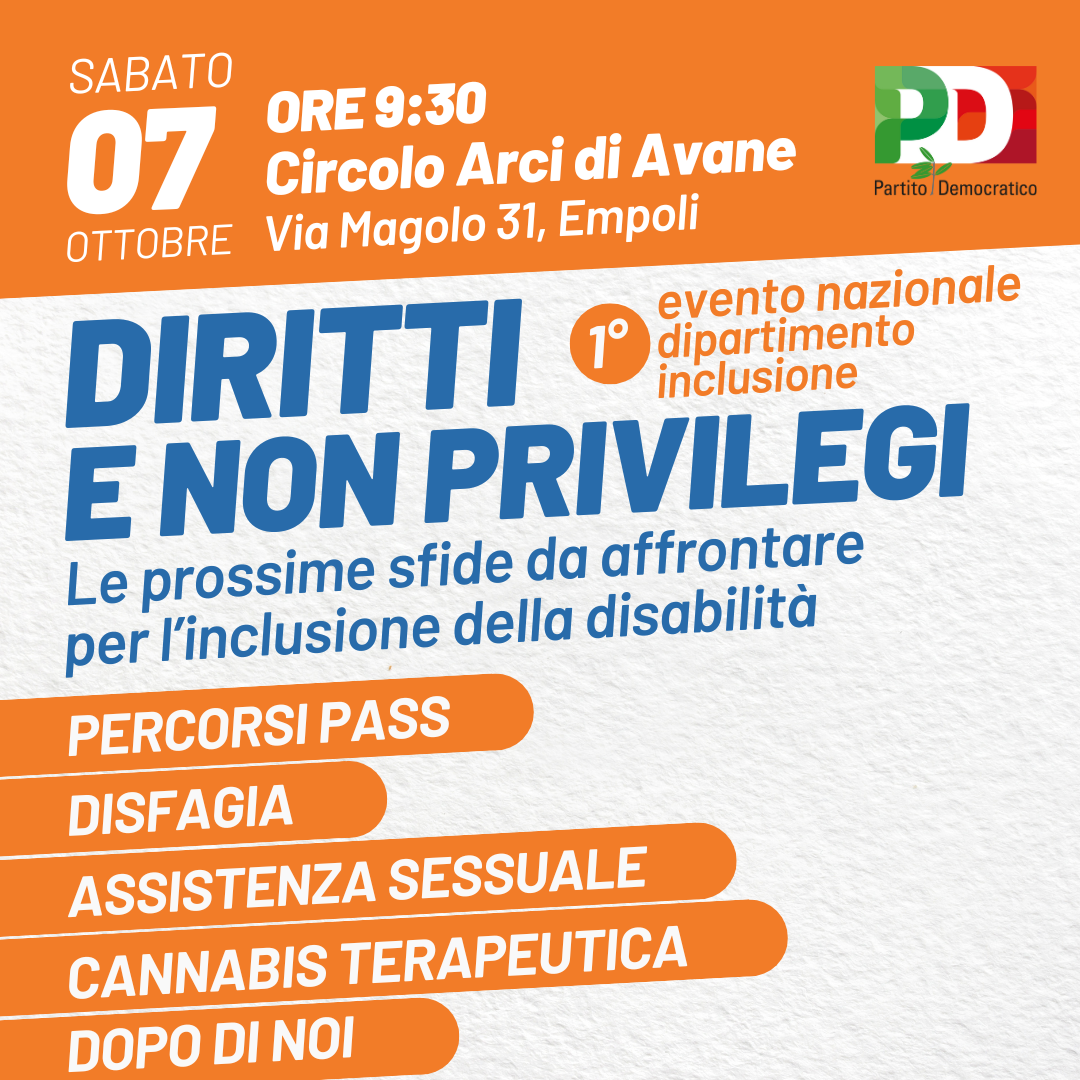 Si terrà sabato prossimo, 7 ottobre, a Empoli al Circolo Arci di Avane (via Magolo, 31) il primo evento del dipartimento Inclusione del Partito Democratico “Diritti e non privilegi. Le prossime sfide da affrontare per l’inclusione della disabilità”.