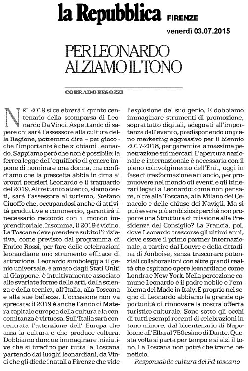 “Per Leonardo alziamo il tono”, Intervento di Corrado Besozzi su La Repubblica del 3 luglio