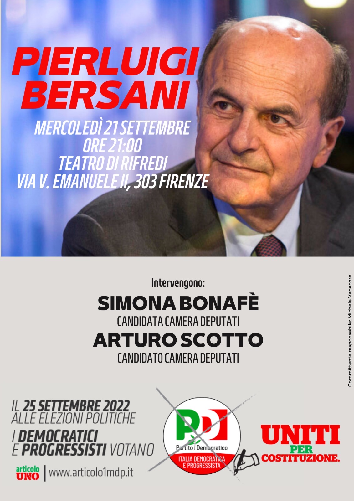 Pierluigi Bersani mercoledì 21 settembre sarà, alle ore 21, al Teatro di Rifredi (FI).