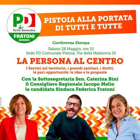 Sabato 28 maggio, alle ore 10 alla sede del Partito Democratico Comunale di Pistoia in via della Madonna n. 25, si terrà una conferenza stampa dal titolo “La Persona al Centro: i servizi sul territorio, i presidi sanitari, i diritti, le pari opportunità: le idee e le proposte”.