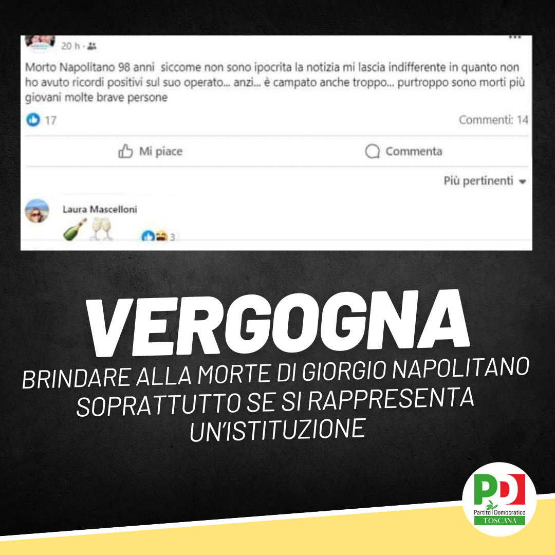 “La consigliera comunale di Piombino Laura Mascelloni, membro della maggioranza del sindaco Ferrari, ‘brindando’ alla morte di Napolitano offende la memoria di un gigante della politica e anche tutti noi.