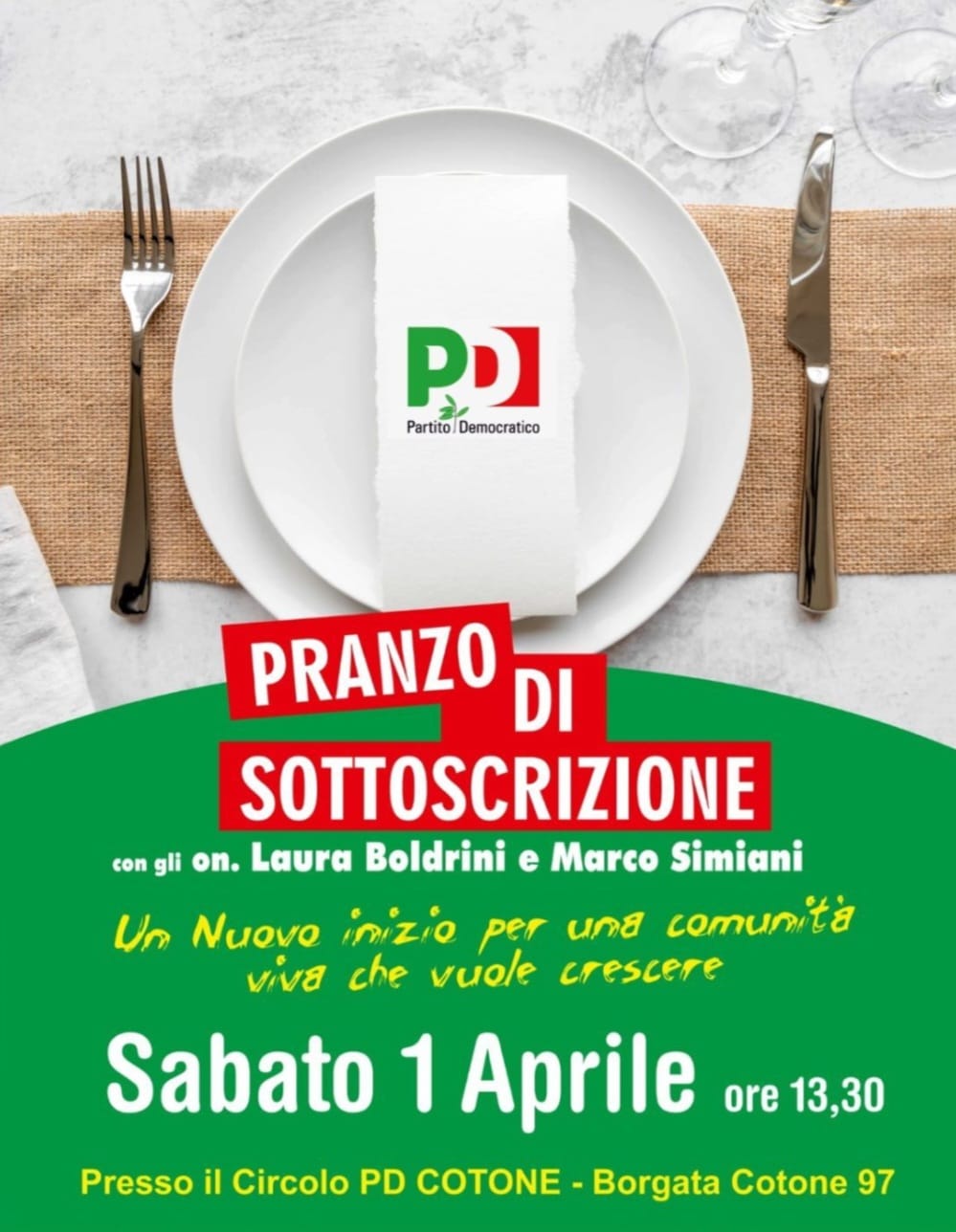 “Un nuovo inizio per una comunità viva che vuole crescere“: pranzo di sottoscrizione con gli onorevoli Laura Boldrini e Marco Simiani sabato 1° aprile alle 13.30. Appuntamento presso il circolo PD Cotone, in via Borgata Cotone 97.