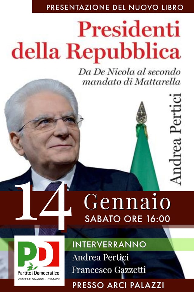 Sabato 14 gennaio alle 16 appuntamento al Circolo ARCI di San Pietro in Palazzi a Cecina per parlare del nuovo libro del Professor Andrea Pertici. Un lavoro di grande qualità dedicato ai Presidenti della Repubblica da De Nicola a Mattarella: un modo per fare un viaggio non solo nella storia della Presidenza della Repubblica ma anche nella vita politica e sociale della nostra Nazione.