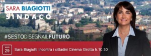 Sabato 29 Marzo 2014 alle ore 10.30 a Sesto Fiorentino al Cinema Grotta in Via Gramsci, 387 presentazione della candidatura a Sindaco di Sara Biagiotti, in vista delle elezioni amministrative che si terranno Domenica 25 Maggio 2014