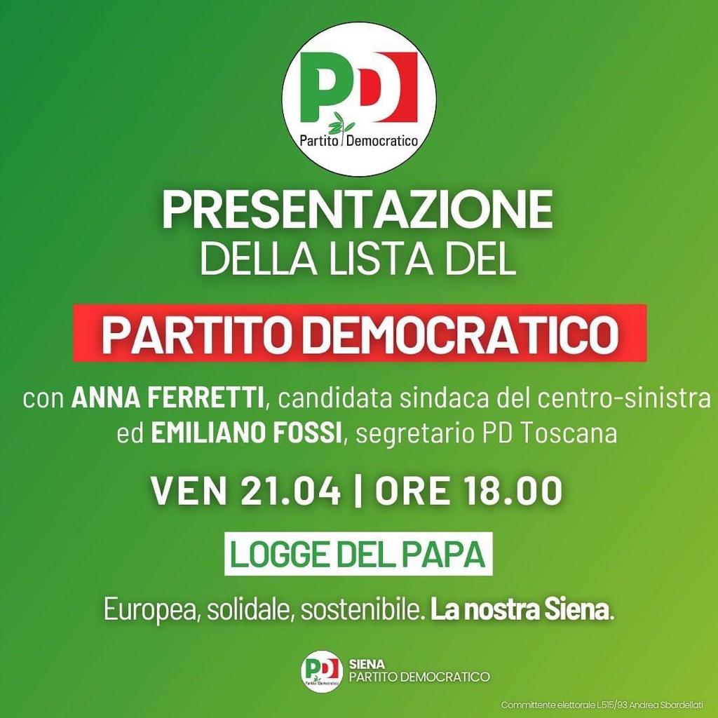 Oggi la presentazione della lista del Partito Democratico con la candidata sindaca Anna Ferretti e il segretario del PD Toscana Emiliano Fossi.