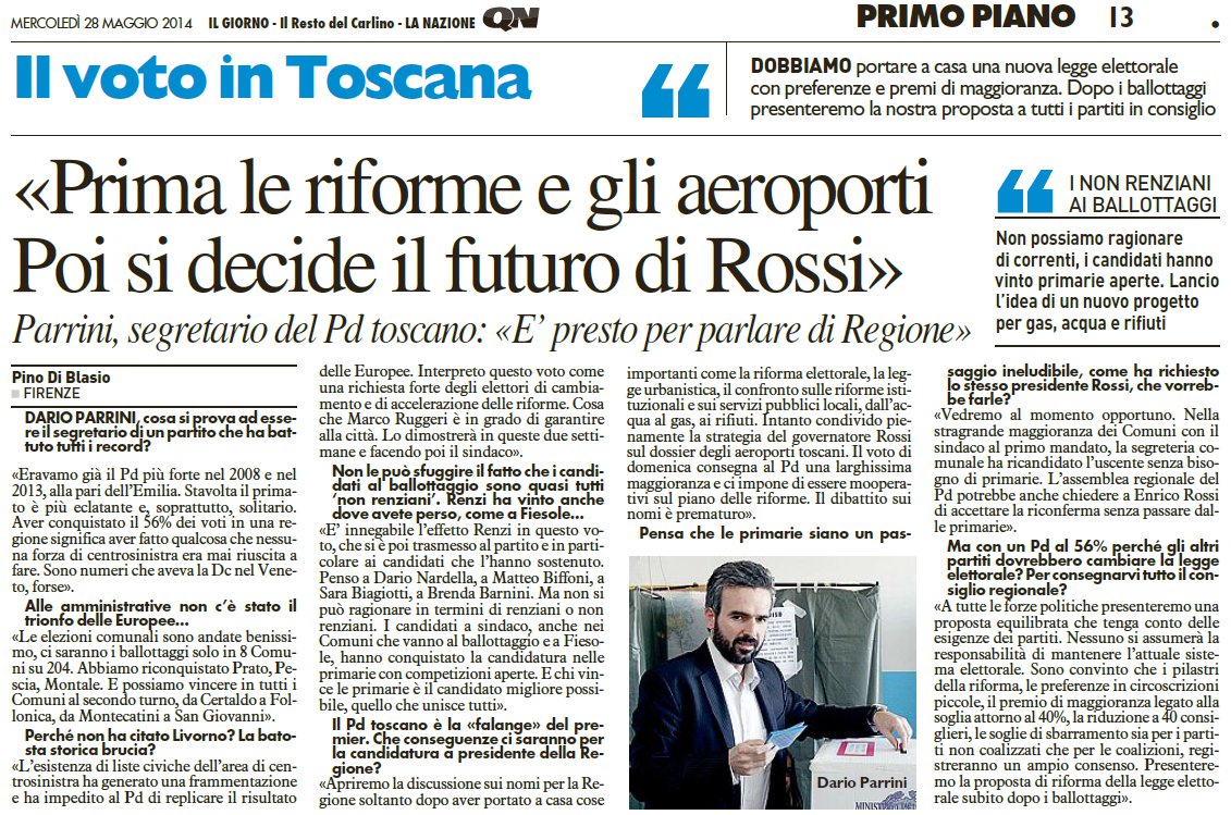 Intervista di Pino Di Blasio al segretario regionale del Pd toscano Dario Parrini su La Nazione del 28 maggio 2014.
