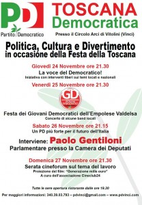 Da giovedì 24 a domenica 27 novembre al circolo Arci di Vitolini, si terrà la quattro giorni di festa Toscana Democratica, organizzata dal Pd Vinci. Sarà l’occasione per parlare di politica, cultura, scuola, lavoro…Non mancheranno inoltre tante occasioni di svago e divertimento, con musica dal vivo e rassegne cinematografiche. Sabato sera, ospite d’onore sarà l’ex ministro delle Comunicazioni Paolo Gentiloni.