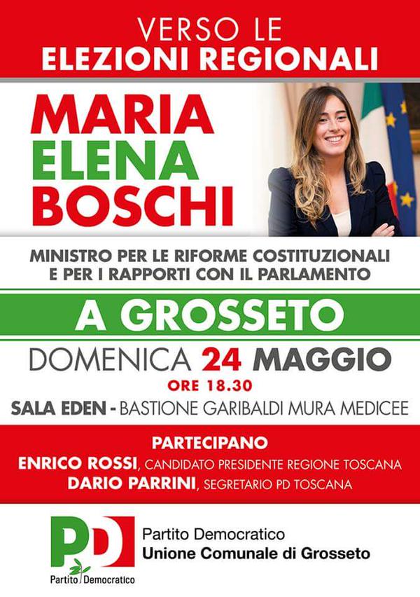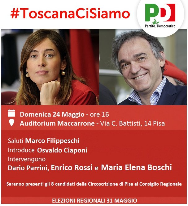 Domenica 24 Maria Elena Boschi, insieme al Presidente Rossi e al segretario regionale Parrini, alle ore 16 sarà a Pisa all’Auditorium Centro Maccarrone con i candidati pisani al consiglio regionale e al sindaco Marco Filippeschi.