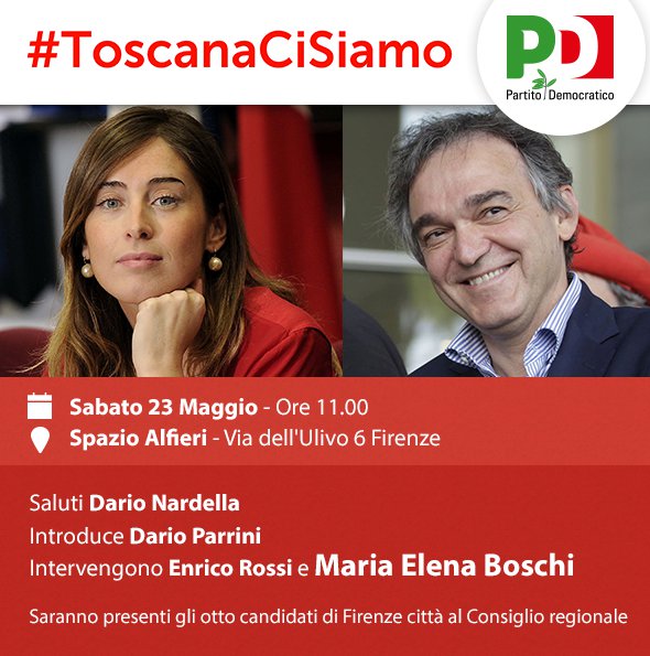 Sabato 23, Il ministro Boschi sarà a Firenze alle ore 11 presso il cinema Spazio Alfieri, via dell’Ulivo 6, per una iniziativa con il Presidente della Regione e candidato alla rielezione Enrico Rossi, Dario Parrini, segretario regionale del Pd, e i candidati fiorentini al consiglio regionale. Saluto iniziale del sindaco Dario Nardella.