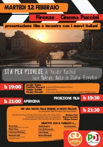 Nato in Italia, espulso. Succede a Said Mahran, figlio di genitori algerini, fiorentino a tutti gli effetti ma non sulla carta d’identità, vittima di una legislazione paradossale che lo costringe ad affrontare un futuro incerto. Said è il protagonista di Sta per piovere”, film del giovane regista italo iracheno, Haider Rashid, nato e cresciuto a Firenze, che verrà presentato martedì 12 febbraio al Teatro Puccini di Firenze ( in via delle Cascine 41)  alle 19 dallo stesso regista – suo anche il pluripremiato lungometraggio Tangled  Up  in Blue”- insieme a Sergio Staino, Patrizio Mecacci, segretario Pd metropolitano di Firenze e Khalid Chaouki, responsabile nuovi italiani Pd e candidato alla Camera nella circoscrizione Campania 2. Alle 19,30 ci sarà la proiezione del lungometraggio, a seguire, apericena alle 21 e alle 21,30 il dibattito Per una nuova Italia insieme ai nuovi italiani, le proposte del Partito Democraticocon Stefano Fusi, coordinatore Forum Immigrazione Pd metropolitano di Firenze, Marco Pacciotti, coordinatore Forum Immigrazione Pd nazionale e Filippo Fossati, presidente Uisp e candidato Pd alla Camera, Diana Kapo, segretaria Gd Firenze, Mauro Fuso, segretario generale della Camera del Lavoro di Firenze, Francesca Chiavacci, presidente Arci Firenze, Mamadou Sall, vicepresidente comunità senegalese Firenze, Emilio Santoro, docente di Diritto degli stranieri all’Università di Firenze, Erica Schiavoncini, responsabile diritti Gd Firenze, Lina Callupe, forum immigrazione Pd Firenze, Matias Mesquita e Sara Benedetti, Forum immigrazione Pd.  Sarà una serata dedicata ai nuovi italiani, alle problematiche delle seconde generazioni di immigrati e quindi alle proposte messe  in campo sul tema dal Partito Democratico. Un occasione anche per dimostrare la solidarietà a Khalid Chaouki, che sta ricevendo da qualche giorno insulti e minacce sul suo profilo Facebook, diventati così pesanti da costringerlo alla denuncia. “Siamo vicini a Khalid e a tutti coloro che si impegnano per la tolleranza e i diritti e riteniamo gravissimo che al giorno d’oggi ci sia ancora chi compie atti così vili: combattere il germe del razzismo è una battaglia in primo luogo culturale che come Partito Democratico vogliamo portare avanti in maniera decisa”, commentano a proposito Patrizio Mecacci e Diana Kapo.
