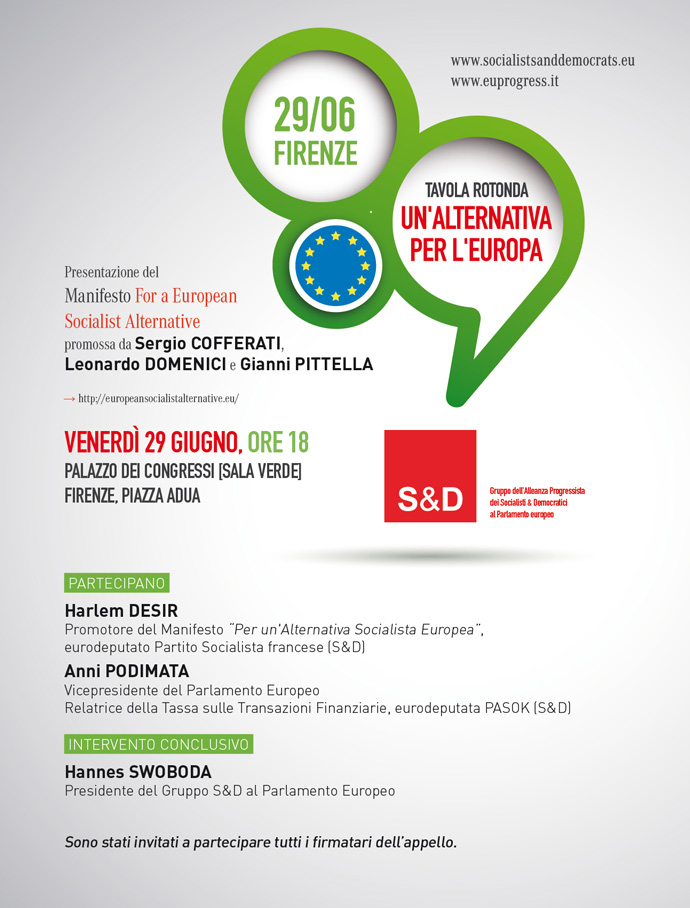 Si terrà a Firenze il prossimo venerdì 29 giugno la tavola rotonda “Un’Alternativa per l’Europa” che a partire dalle ore 18 nella Sala Verde del Palazzo dei Congressi seguirà le tematiche del Manifesto di Harlem Desir “Per un’Alternativa Socialista Europea”.