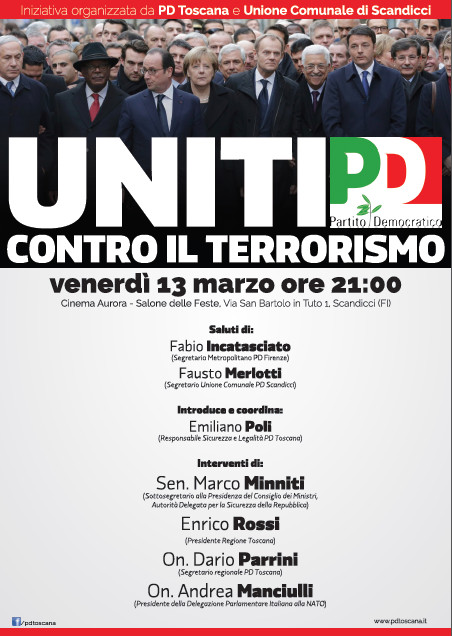 10 marzo 2015 – “Uniti contro il terrorismo”, questo il titolo dell’iniziativa che si terrà venerdì 13 marzo alle 21, presso il Salone delle feste del Cinema Aurora di Scandicci (Via San Bartolo in Tuto 1) organizzata dal Pd della Toscana e dal Partito Democratico scandiccese che vorrà fare il punto sul pericolo e le reali minacce terroristiche internazionali mirate sull’Italia.