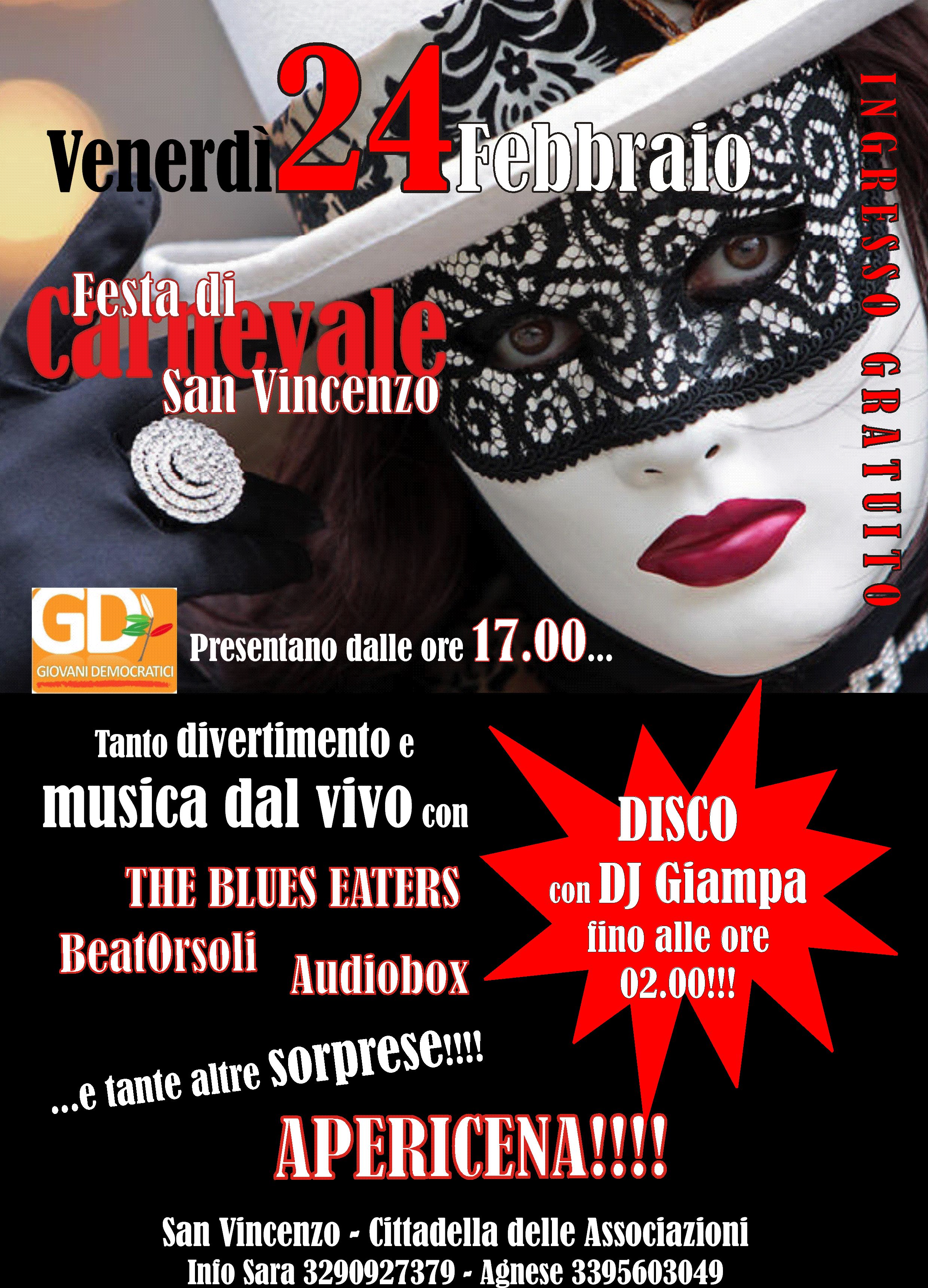 Venerdì 24 febbraio dalle ore 17 fino a tarda notte, presso la Cittadella delle Associazioni in via S. Pertini, si svolgerà una grande festa in maschera, ad ingresso gratuito, alla quale sono tutti invitati.