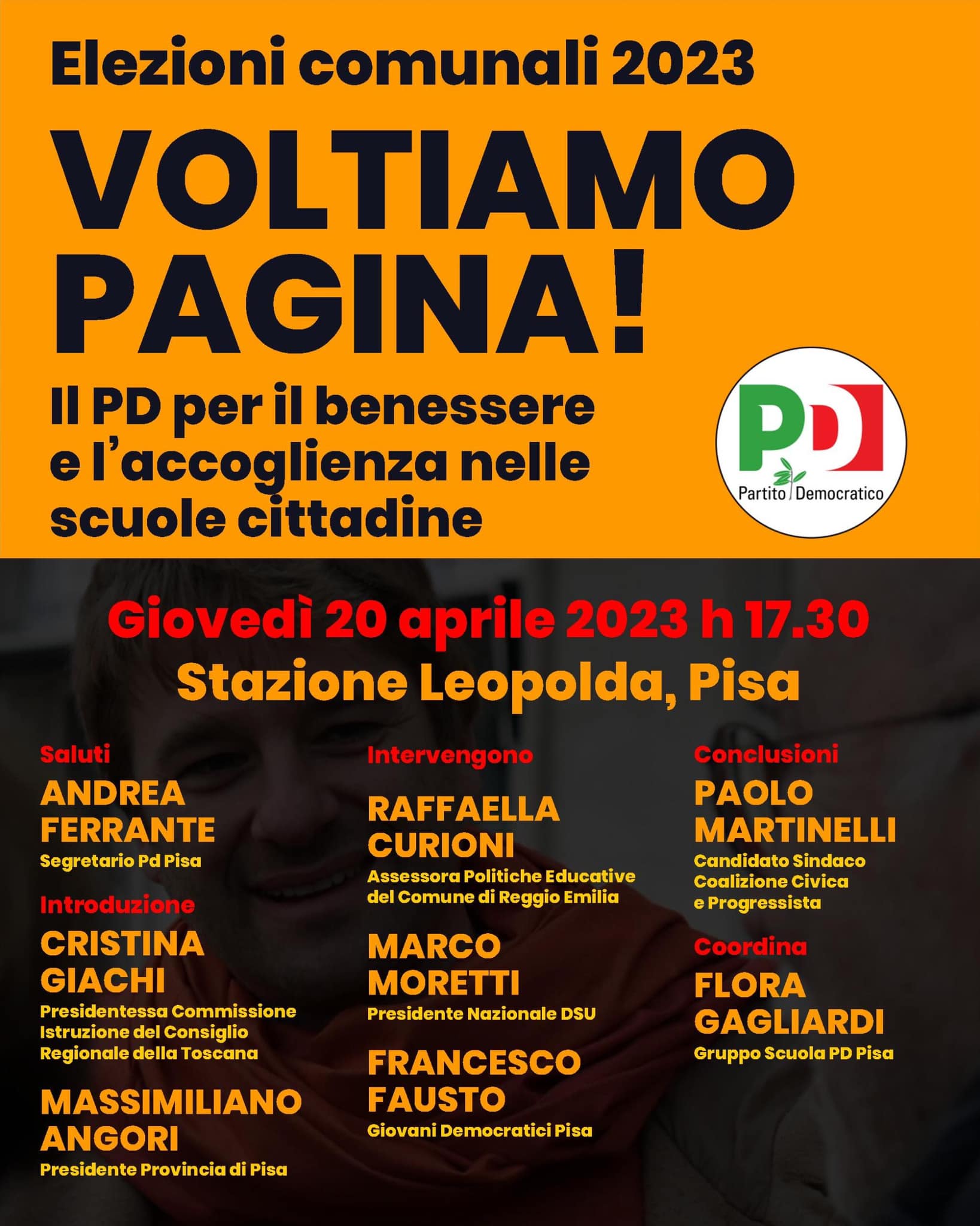 Il Gruppo Scuola del PD organizza un incontro tematico sulle politiche educative a sostegno del candidato sindaco Paolo Martinelli. L’iniziativa, intitolata Voltiamo Pagina, si svolgerà giovedì 20 aprile alle ore 17.30 presso la Sala Convegni della Stazione Leopolda in piazza Guerrazzi a Pisa.